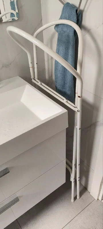 Идеально подходит для маленьких помещений, занимает мало места, удобно сливать. Есть небольшой скол краски и следы ржавчины на металлической подставке.