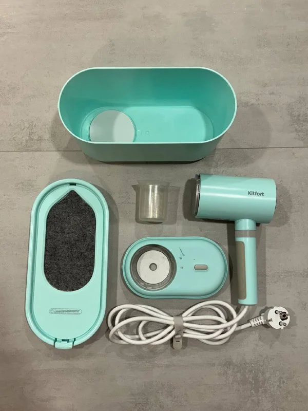 В комплекте: бокс для хранения, стаканчик, насадка утюг. Довольно маленький, можно брать с собой в поездки.