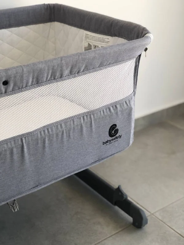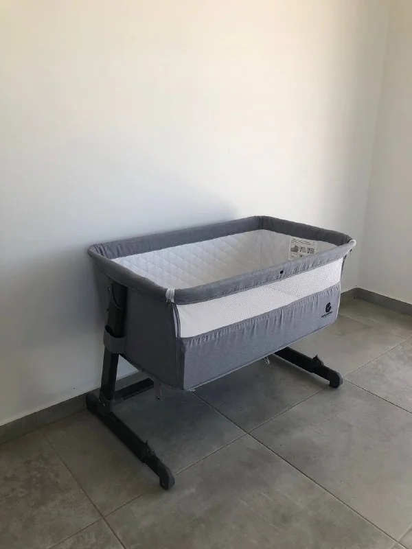 Одна сторона отстегивается. регулируется по высоте и дает возможность поставить вплотную к взрослой кровати. В комплекте есть матрасик и ремень для фиксации кроватки.