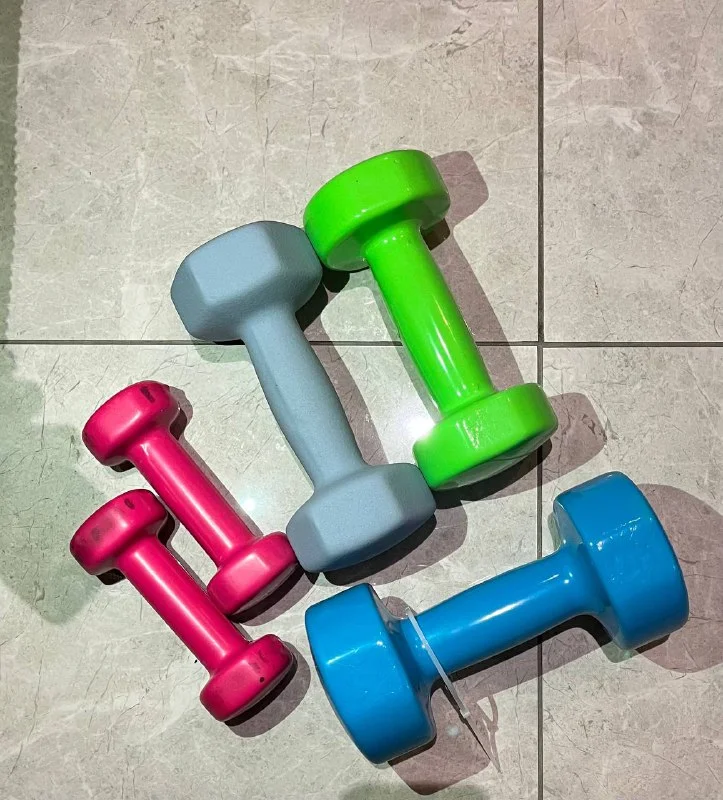 Гантели 5 кг 1 шт - 7 евро, 3 кг 2 шт по 5 евро каждая, 1 кг 2 шт (немножко запачкались в зале о покрытие) 2 евро за обе. Все вместе 15 евро