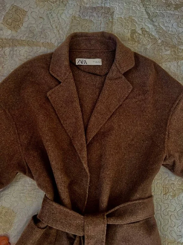 Очень мало был одет, шоколадный цвет, размер xl, два накладных кармана, пояс, без пуговиц. Длинна рукава регулируется, можно закатить побольше, по бокам небольшие разрезы.