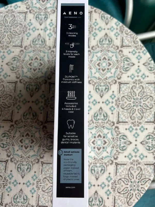 Абсолютно новая в запломбированной упаковке зубная щетка AENO. Имеет технологию звуковой вибрации, которая, как клинически доказано, стирает налет гораздо эффективнее, чем обычные зубные щетки. При этом не бьет по зубам и не травмирует десна как электрическая. DB3 имеет режимы чистки и 3 градуса скорости для каждого режима, которые включают 9 сценариев для полного ухода за полостью рта. Удобная беспроводная зарядка через компактную базу - одна зарядка обеспечивает до 40 дней ежедневного использования. Стильного черного цвета. Цена 30€, в магазине и на сайте она 39€. Территориально Гермасойя туристерия