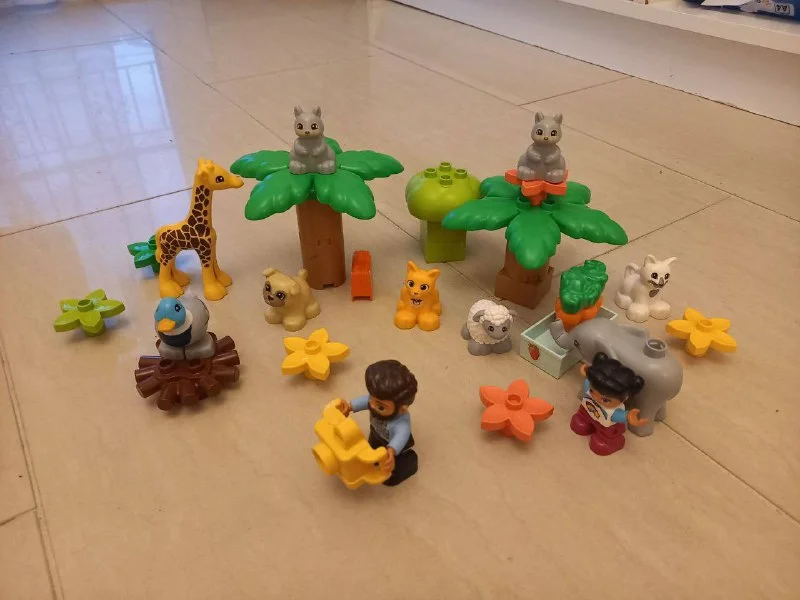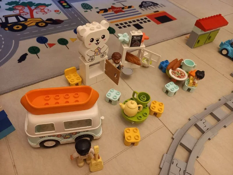 Несколько наборов лего дупло. И самое главное железная дорога, по которой ездит поезд.