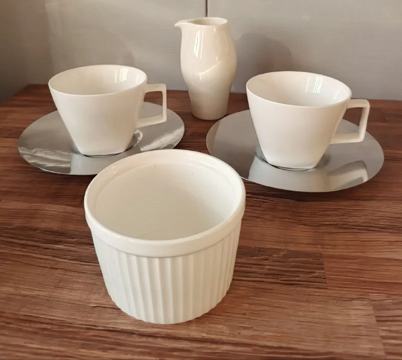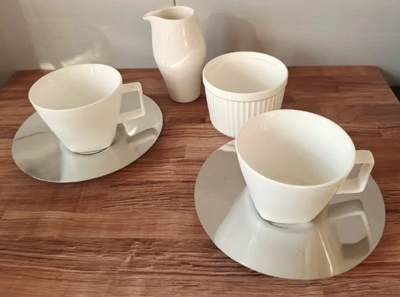 Очень красивый тщательно собранный сет: чашки среднего размера Austrian Verso design Diana, объемом приблизительно 170 мл, идеально под кофе машину/капсульный кофе. Тонкие железные блюдца Luidgi Bormioli, сахарница и молочник Wilmax England. За все 18 евро. Лимассол ❤️