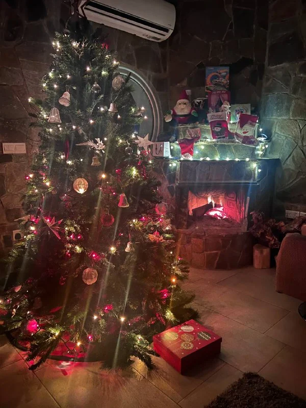 Большая высокая елка (2м) +большая коробка украшений (+те что на камине) так же есть отдельные елочные заснеженные ветки (мы украшали входную дверь) 70€ за все