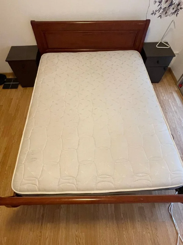 Продаю двуспальную кровать с матрасом и двумя прикроватными тумбочками в хорошем состоянии.