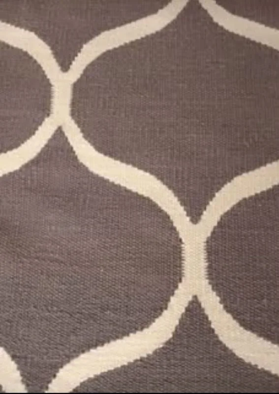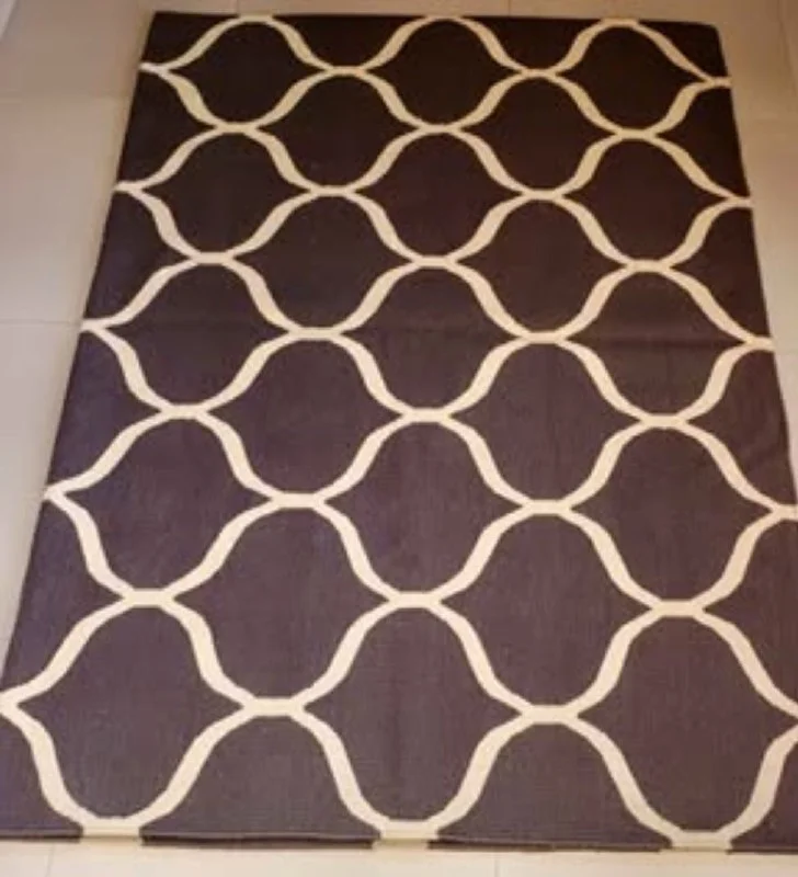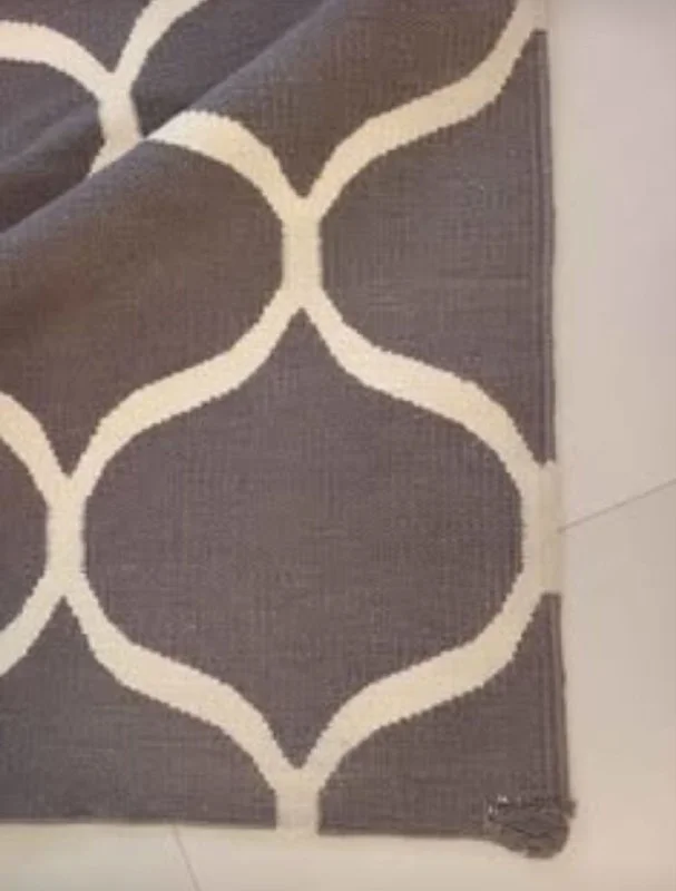 The rug is new, haven't been in use. Made of wool, dark grey color with ivory details. One corner has a small, not significant damage.