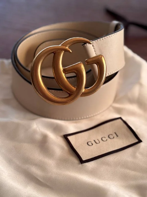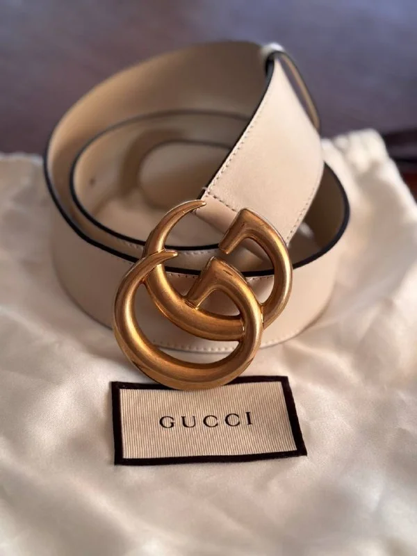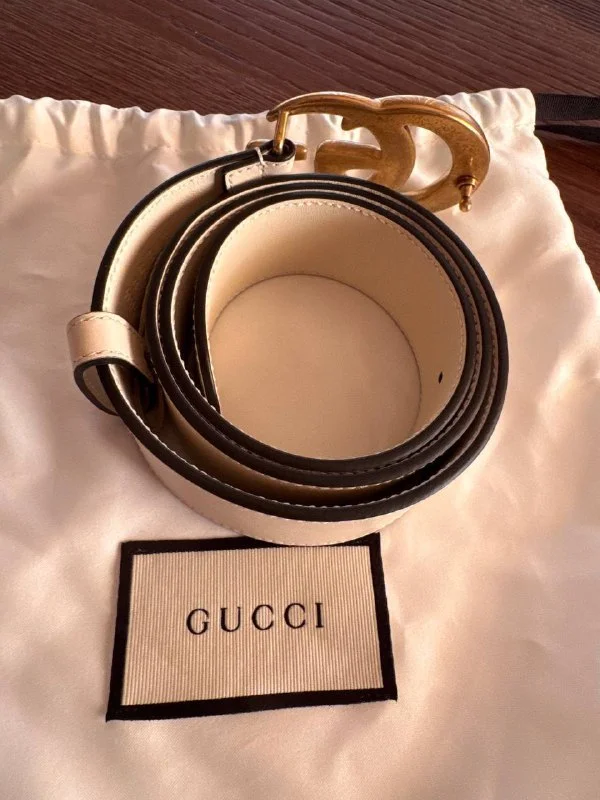 Новый классический ремень Gucci в цвете слоновой кости из гладкой кожи и с пряжкой GG из состаренного золота. Размер 75см, ширина 4см