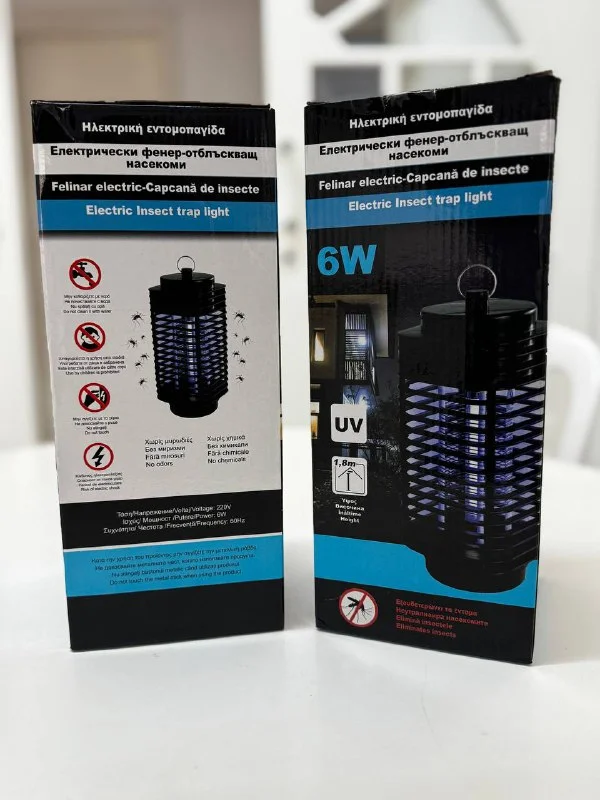 Продаю комплект из двух электрических УФ-ловушек для насекомых 6W. Эффективное и безопасное решение против комаров, мух и других летающих насекомых без химии и запахов. Работают на ультрафиолетовом свете, который привлекает насекомых и уничтожает их электрической решёткой. Подходят для дома, балкона, террасы, дачи, кафе и офисов. Тихая работа, экономичное энергопотребление, возможна установка на поверхность или подвешивание. Рекомендуемая высота установки 0,8–1,2 м, лучшее размещение — возле дверей и окон. Состояние новое, в заводской упаковке. Комплект 2 штуки. Цена за всё — 20 евро.