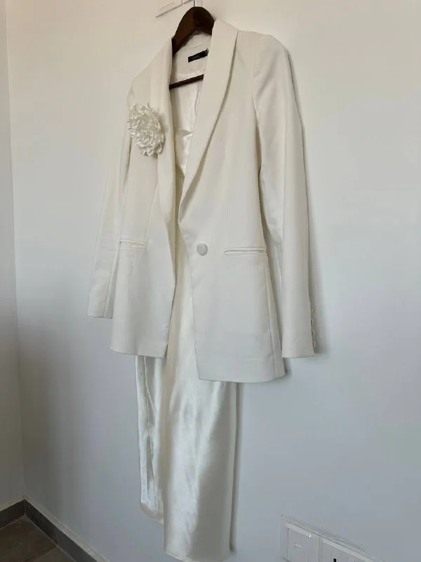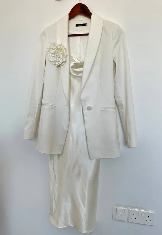 42-44 р . Отдам молочный пиджак с цветком ( брошь отстегивается ) и платье комбинация , бренд MANIC .