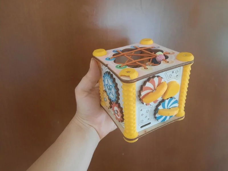 Бизи кубик: шестеренки-трещетки, липучки, бусинки-лабиринт, открывающаяся дверца, внутрь помещается пара-тройка маленьких игрушек:) идеально в дорогу. 4е