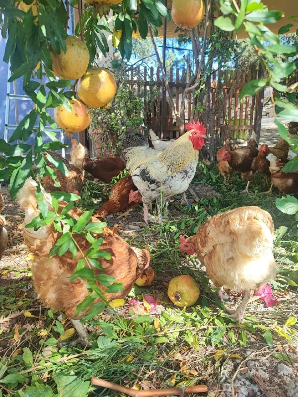 Мои куры пасутся в саду вдали от дорог.