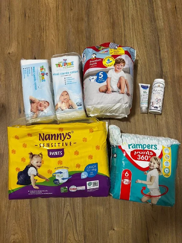 Набор всякого добра - закрытые две пачки больших ватных дисков, пачка трусиков Лупи Лу 5 размер (без 1ой штуки), Nanny’s 5 трусики полная пачка, Памперс 6 трусики полная пачка. Но вскрытые, смотрела размер. 25€ за все.