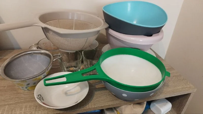 Набор посуды бу. 2 стакана, чашка, большая чашка с мерными делениями, дуршлаг, сито, 3 больших тарелки, 2 маленьких тарелки, 2 затейника, две глубокие чашки. За всё 10 евро. Ларнака, финикудес