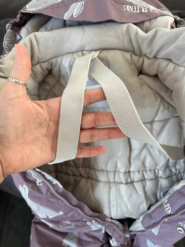 Очень теплый, на температуру до -25. Капюшон отстегивается. Есть ремни, чтобы снять верхнюю часть в помещении. Внизу есть съемные стремена для фиксации обуви.