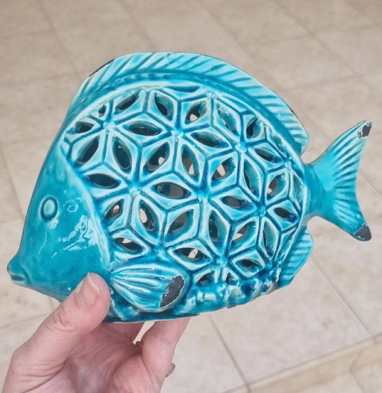 Декоративная керамическая рыбка с фабричными "эффектами старения", характерного морского (лазурного) цвета, идеальна как декор приморской виллы. Длина 20 см. Цена 15 евро