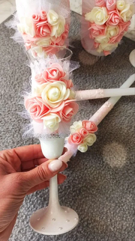 Свадебный набор для молодоженов.Полностью ручная работа!отдаю Весь по заниженной цене 100 е.Бокалы,свечи и полное шампанское.Ларнака.