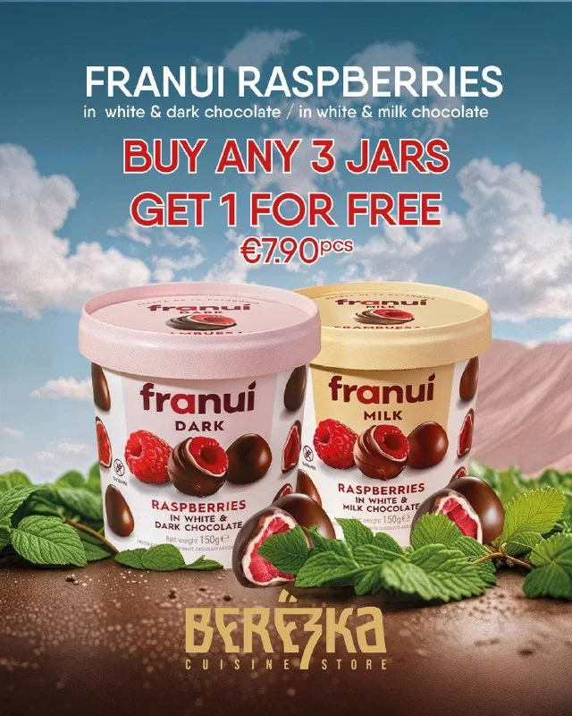 При покупке любых 3-х банок замороженной малины franui в молочном или темном шоколаде, 4-я банка малины в подарок!