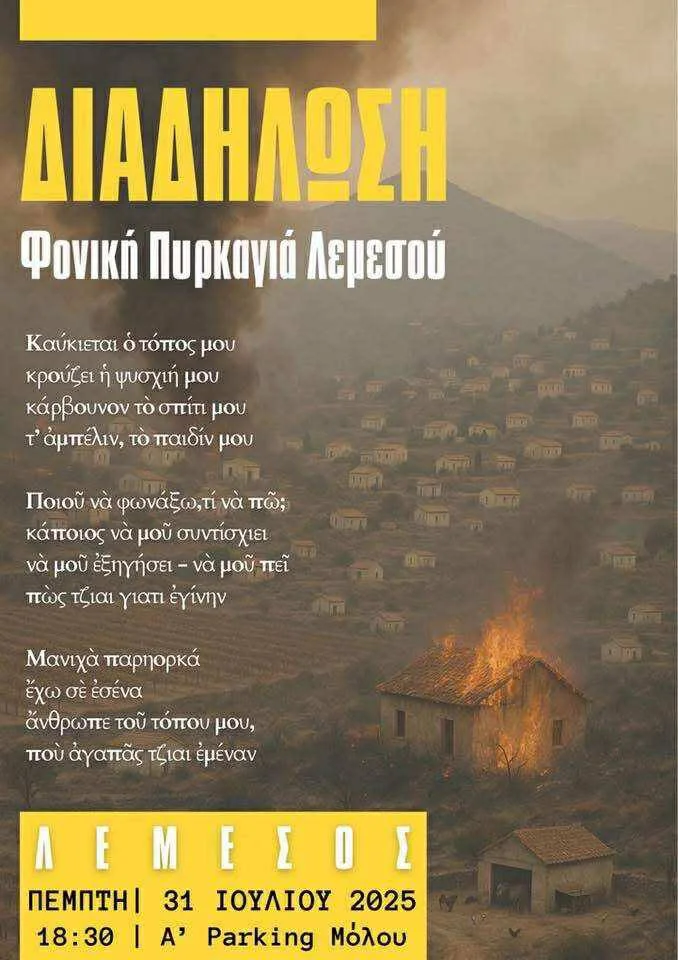 31 июля 2025 года в 18:30 в Лимассоле пройдет акция протеста в ответ на разрушительный пожар, унесший жизни двух человек и уничтоживший более 120 квадратных километров земли. Участники выступят с призывом о помощи и объяснении причин трагедии, выражая свою боль и потерю.