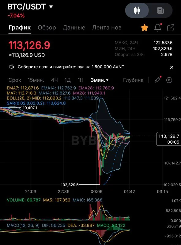 📉 Крипторынок тоже в панике: Биткоин упал до $102 300, а TON рухнул на 80% — до $0,5, но затем резко отыгрался до $1,6.