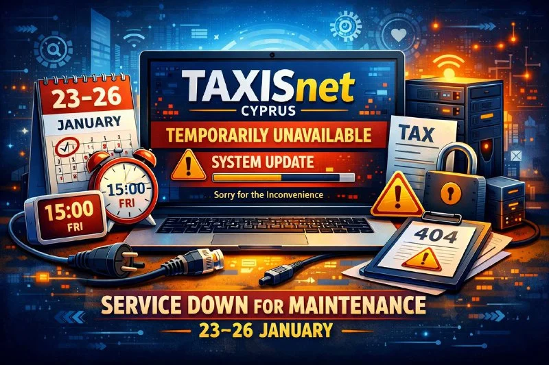 Налоговое управление Кипра предупредило о плановой технической модернизации, из-за которой электронные сервисы временно перестанут работать. С 15:00 пятницы, 23 января, до 9:00 понедельника, 26 января, будут недоступны платформа Tax For All, портал TAXISnet, а также раздел «Просроченная задолженность» на сайте gov.cy.