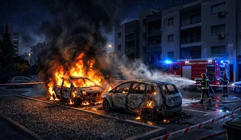 🔊Ночной пожар в Лимассоле: огонь уничтожил одну машину и повредил соседнюю