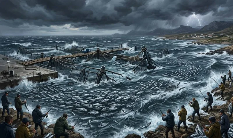 🔊**Шторм разорил рыбную ферму в Лиопетри: тысячи морских окуней и лещей уплыли в море