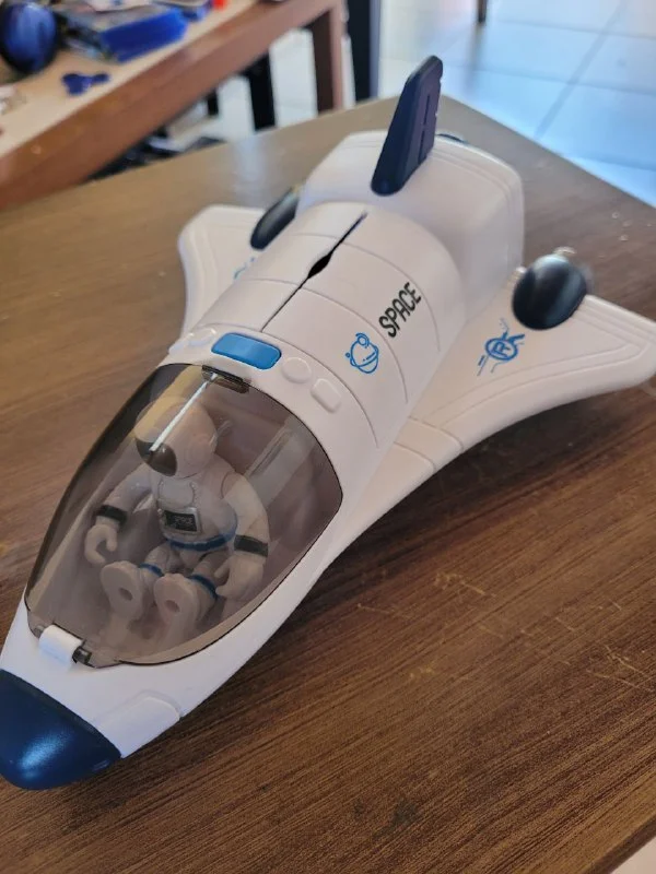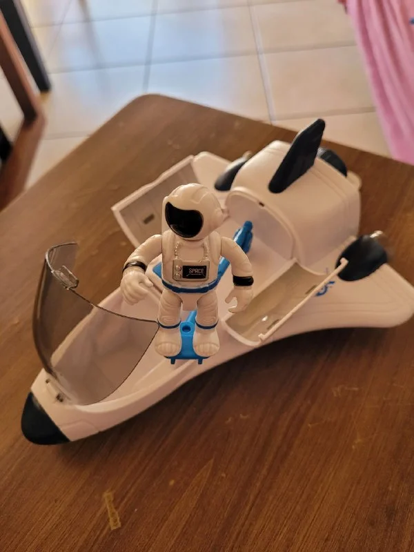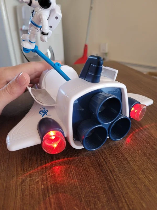 Издаёт звуки взлёта, горят лампочки красным. Космонавта можно сажать в кабину. А также он на колёсиках. Доп фото/видео вышлю если нужно.