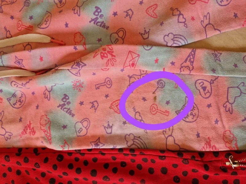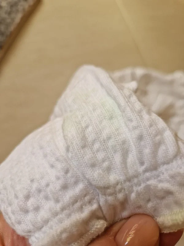 На рукавах еле видные зеленые разводы по шву у запястья. Их почти не видно, если застирать с отбеливателем, думаю, что отойдут