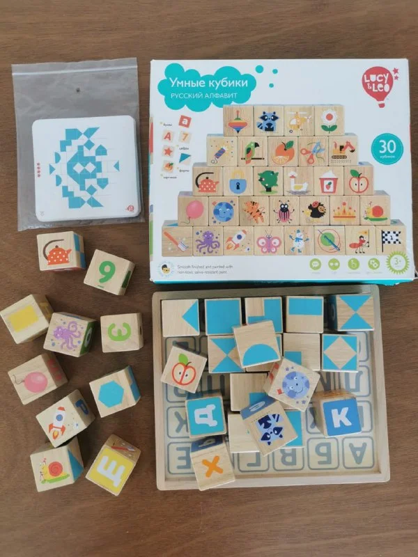 Набор деревянных кубиков Lucy and Leo:формы, картинки, цифры, русский алфавит, игра танграм -25€. Состояние нового, почти не играли