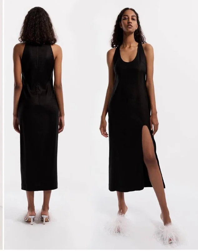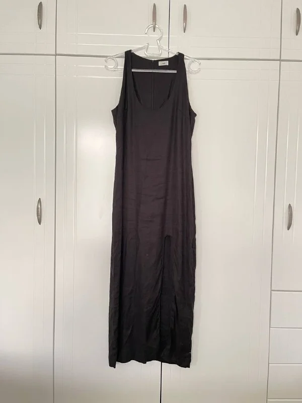 Платье миди из льна и вискозы с высоким разрезом спереди. На изделии имеются небольшие следы износа. В целом, состояние платья отличное.