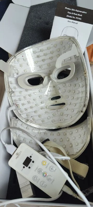 В комплекте маска для лица, маска для шеи, крепежи для ушей, крепеж для шеи, пульт, нераспакованная сыворотка.