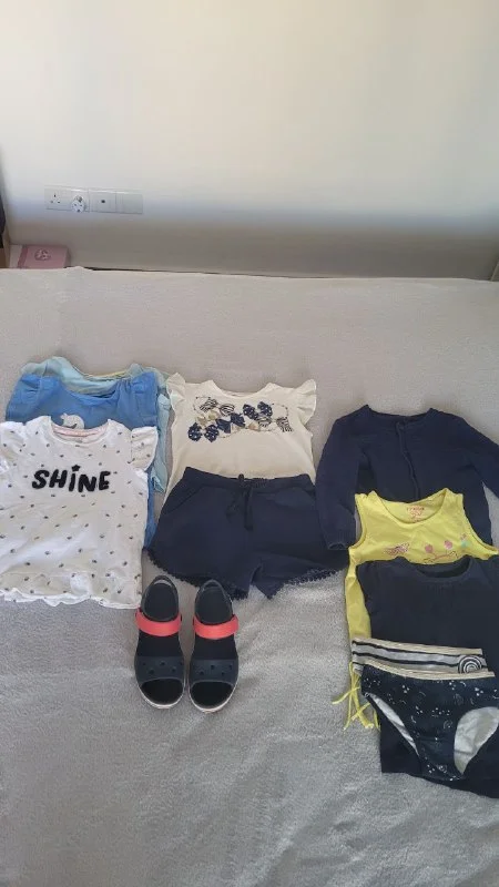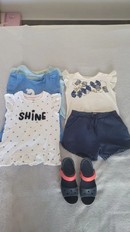 Продам шорты и футболку(mayoral) на рост 110-116, футболки(mothercare) и босоножки crocs( c13) все за 40€