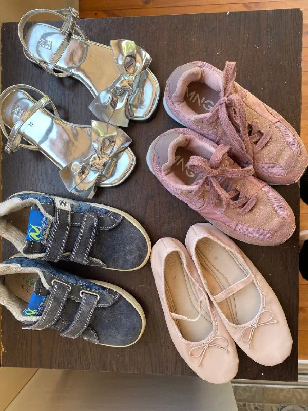 4 пары обуви на 32 размер ( не маломерки) замшевые на липучках Naturino, розовые Mango, балетки Zara- есть следы носки, серебрянные с бантом сандалии Zara ( один выход) -10 евро за ВСЕ. По отдельности не продаются. Юниверсал.