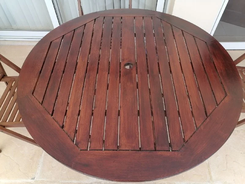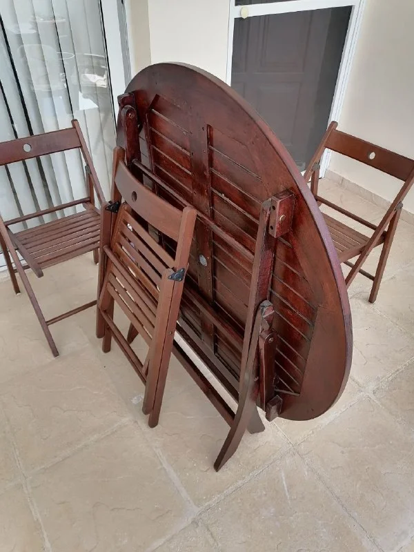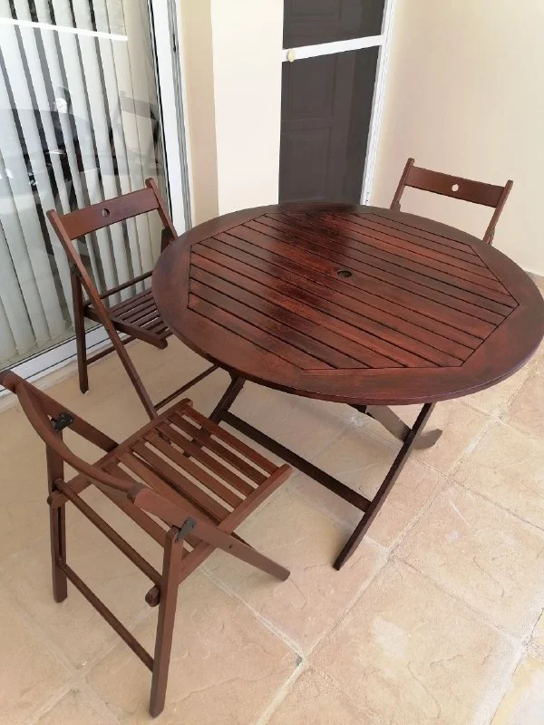 Деревянная мебель для терассы. В отличном состоянии, использовалась только внутри дома. Диаметр стола 110см. +3 стула. Все складывается/раскладывается.