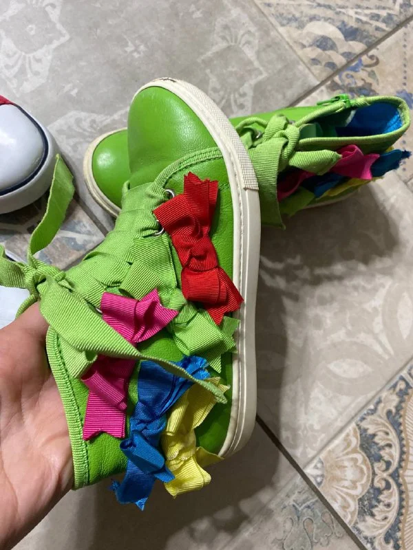 Mimisol 32- зелёные высокие ботики с бантами. Кожа внутри и снаружи, премиум итальянская марка, смотрятся на ребёнке очень красиво. 20 евро.