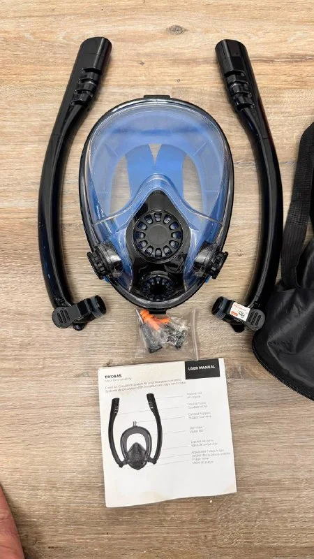 Маска для сноркелинга Twobas с системой двойных трубок и обзором на 180 градусов. Маска оснащена клапаном для выдоха, системой циркуляции воздуха и поддержкой для камеры. В комплект входят: маска, аксессуары для сборки, инструкция и чехол для хранения.