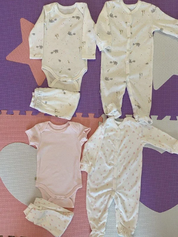 2 бодика, 2 штанишек, 2 комбинезона. Вещи новые, не постираны. Цена: 20€.