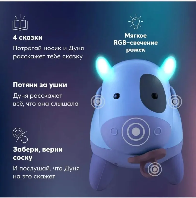 Множество функций. Говорит, ходит, смеётся, просит соску, повторяет фразы, ночник, колыбельные песни, сказки.