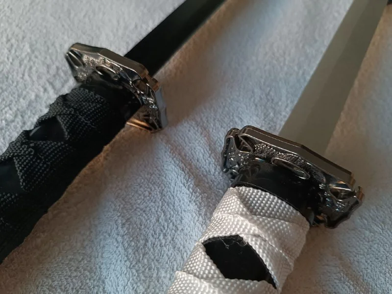 Чёрная изогнутая, деревянная катана и белая прямая, деревянная катана.