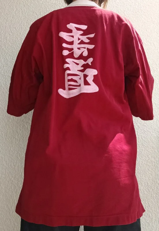 Укороченное красное кимоно с короткими рукавами, карманами и нарисоваными японскими иероглифами (ручная работа).