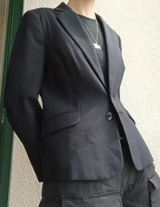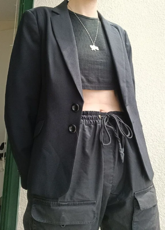 Чёрный женский пиджак F&F, немного приталенный.
