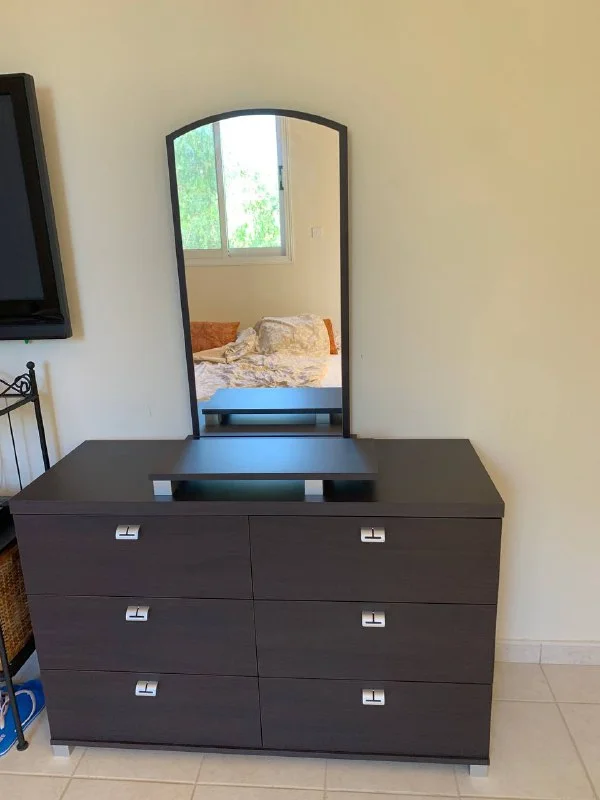 Продается комод с зеркалом, 2 прикроватные тумбочки, кровать под матрас 160*200, цена 240 евро за весь сет. Самовывоз из Писсури.