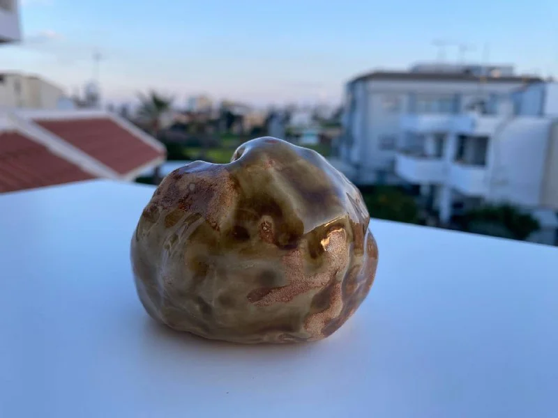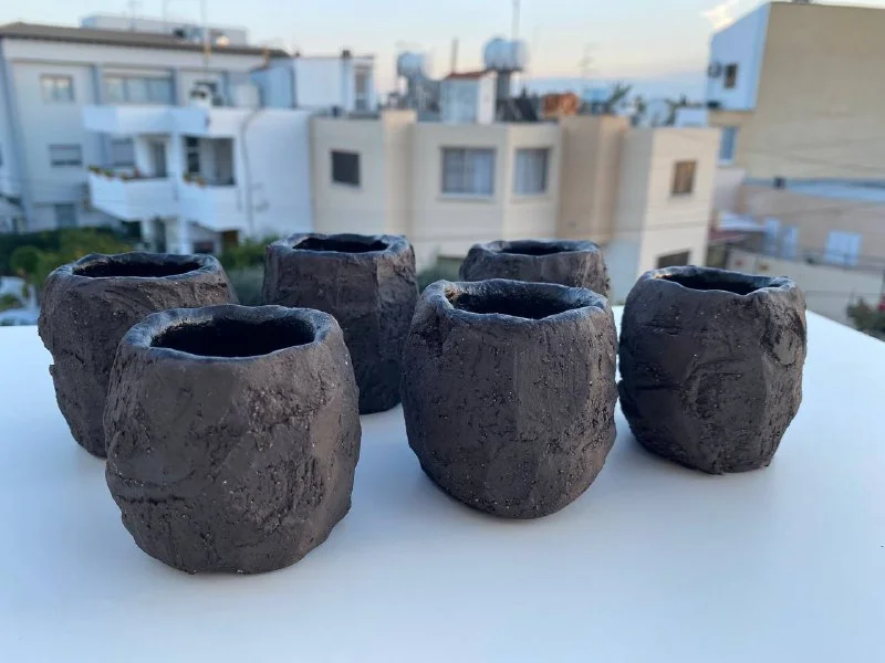 Ручная лепка из темно-коричневой шамотной глины (мелкая белая крапинка, см последнее фото). Снаружи - без глазури, внутри - черная глазурь. Можно использовать для напитков. Объем примерно 150мл.