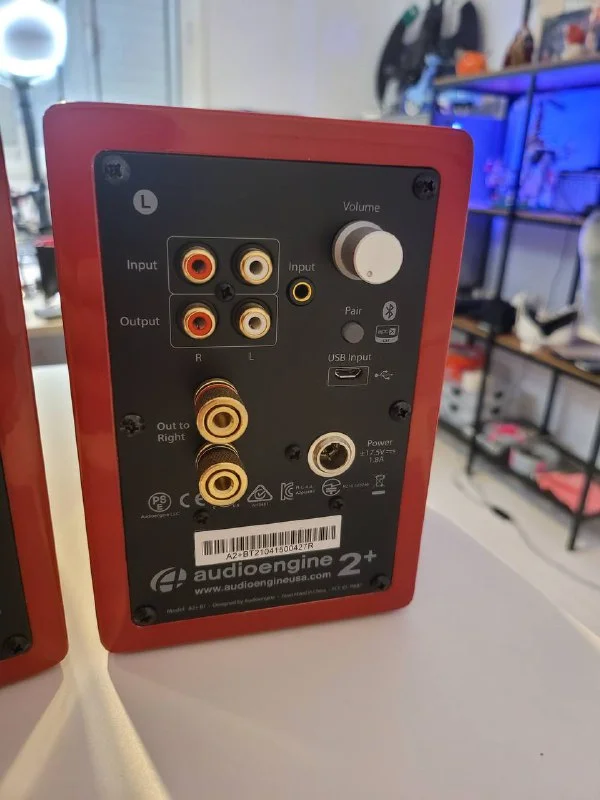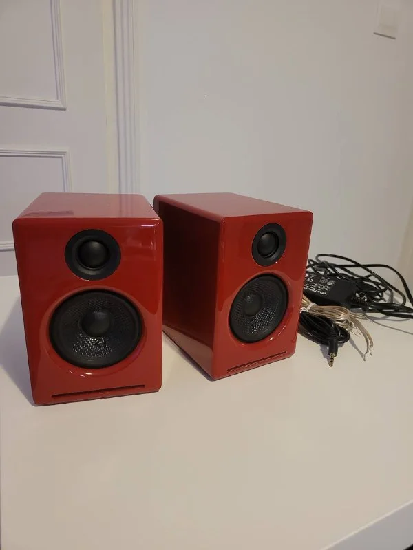 Колонки Audioengine A2+. 60W, 4 способа подключения: bluetooth, usb, aux и rca. Отличный звук. В комплекте провод аукс и блок питания. Причина продажи - понял что в основном пользуюсь наушниками или колонками самого макбука.