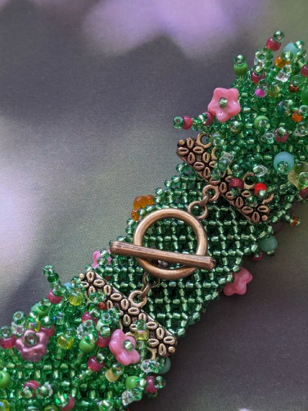 Браслет плетёный и расшитый бисером и стеклянными бусинами "Розовые цветы", 19,5*2,5 см( на обхват запястья 17-18 см), удобная застёжка тогл.