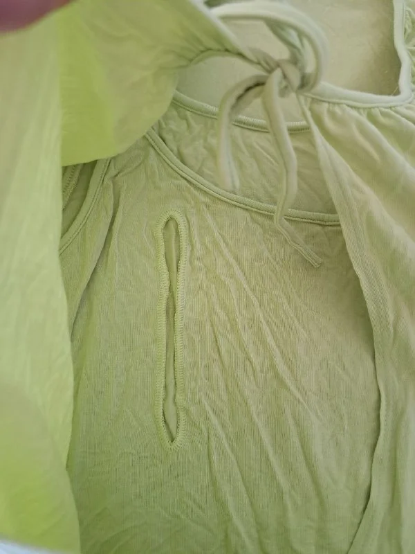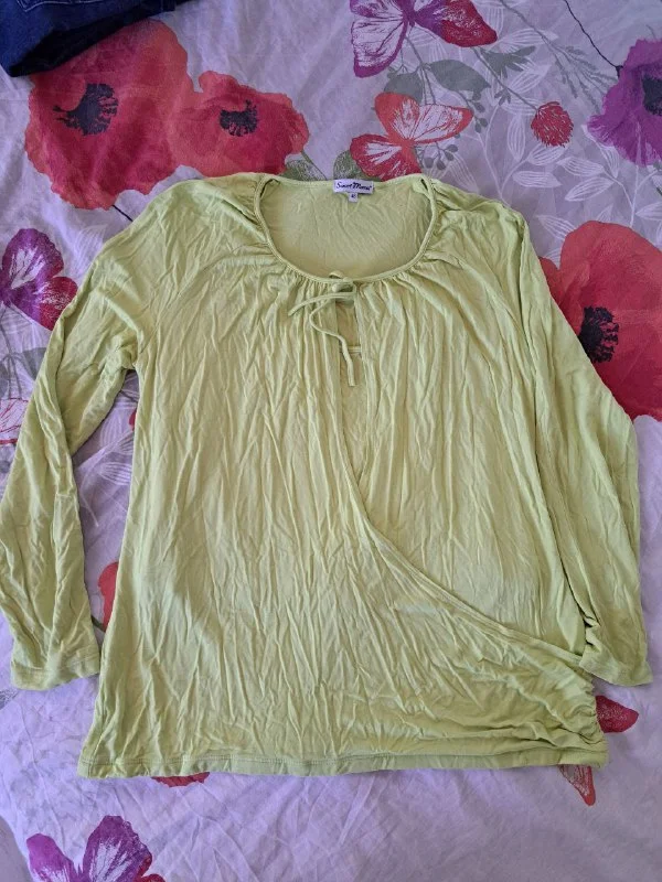 Трикотажный лонгслив для кормления, тонкий и приятный к телу (сорри, что неглаженный). Цвет более салатовый, фото не передает. Размер 48 российский.