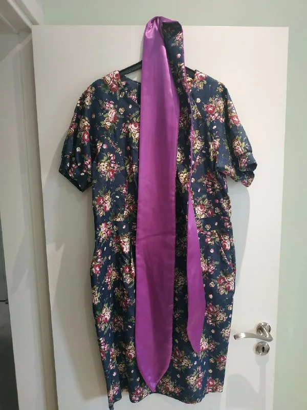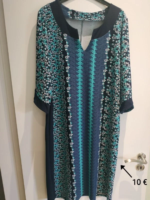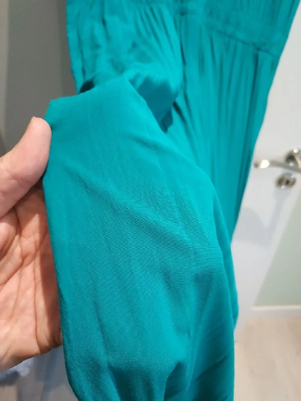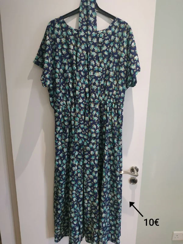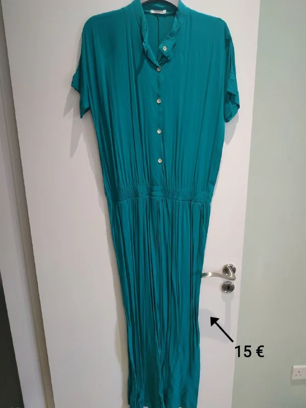 Длинное платье, хлопок, пояс на резинке, карманы, цвет чуть более зелёный, на фото не передался. 15 евро