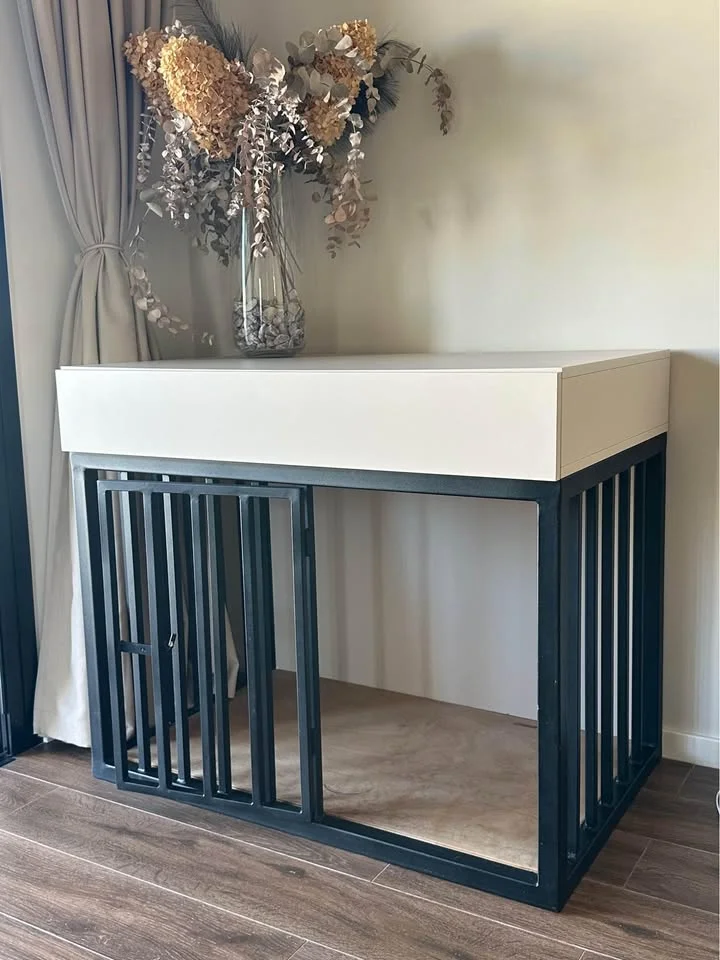 С трех сторон стальные прутья черного цвета, стенка такого же цвета как ящик и столешница.