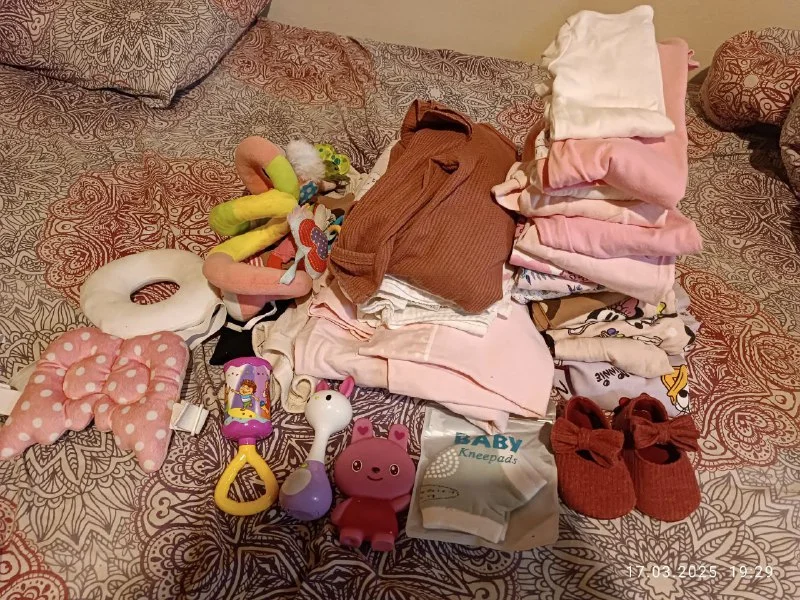 А также игрушки, комплект детского постельного белья, пеленки теплые и муслиновые, защита от падения, бодики, слипы, колготки три пары, шапочки две одна из них на завязке